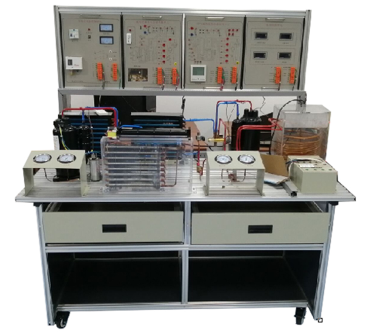 實訓桌采用工業(yè)標準鋁型材件與鈑金結構件拼裝而成,結構堅固,造形美觀大方;設有二個大抽屜,用于放置實訓導線或工具等。實訓桌臺面用于放置熱泵型家用空調和空氣源熱泵系統的元器件并提供一個寬敞舒適的工作臺面,學生可以在工作臺面上將制冷系統的器件任意安裝,實訓桌還設有四個萬向輪,便于移動和固