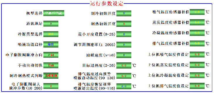 11)、顯示界面上29 路參數控制參數設置/查詢:控制器內所有與控制相關的溫度參數、時間參數、控制參數、等29個參數都可以調整,以適應制冷/熱泵/冷庫/水機等設備。