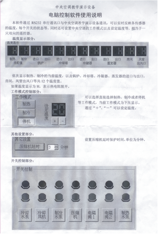 為了更好地滿足各大院校的教學(xué)需要,在原來開發(fā)的中央空調(diào)實驗設(shè)備的基礎(chǔ)上,配備了RS-232串行通訊接口,可直接與電腦連接,由電腦控制軟件控制整個實驗臺的運行,包括:總控臺啟動、制冷、制熱、冷卻水泵、冷卻風(fēng)機、制冷水泵、壓縮機、電磁閥、制熱水泵做演示,制冷、制熱的溫度設(shè)定等。